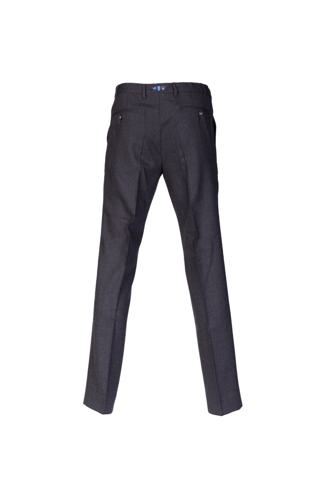 • Брюки полуприлегающего силуэта с классической посадкой. Модель выполнена из шерстяной ткани запатентованной марки «Marzotto». Гульфик на молнии, пояс застегивается на две пуговицы и крючок. Имеет два боковых кармана и два задних с застежкой на пуговицы. Все пуговицы из натурального рога.