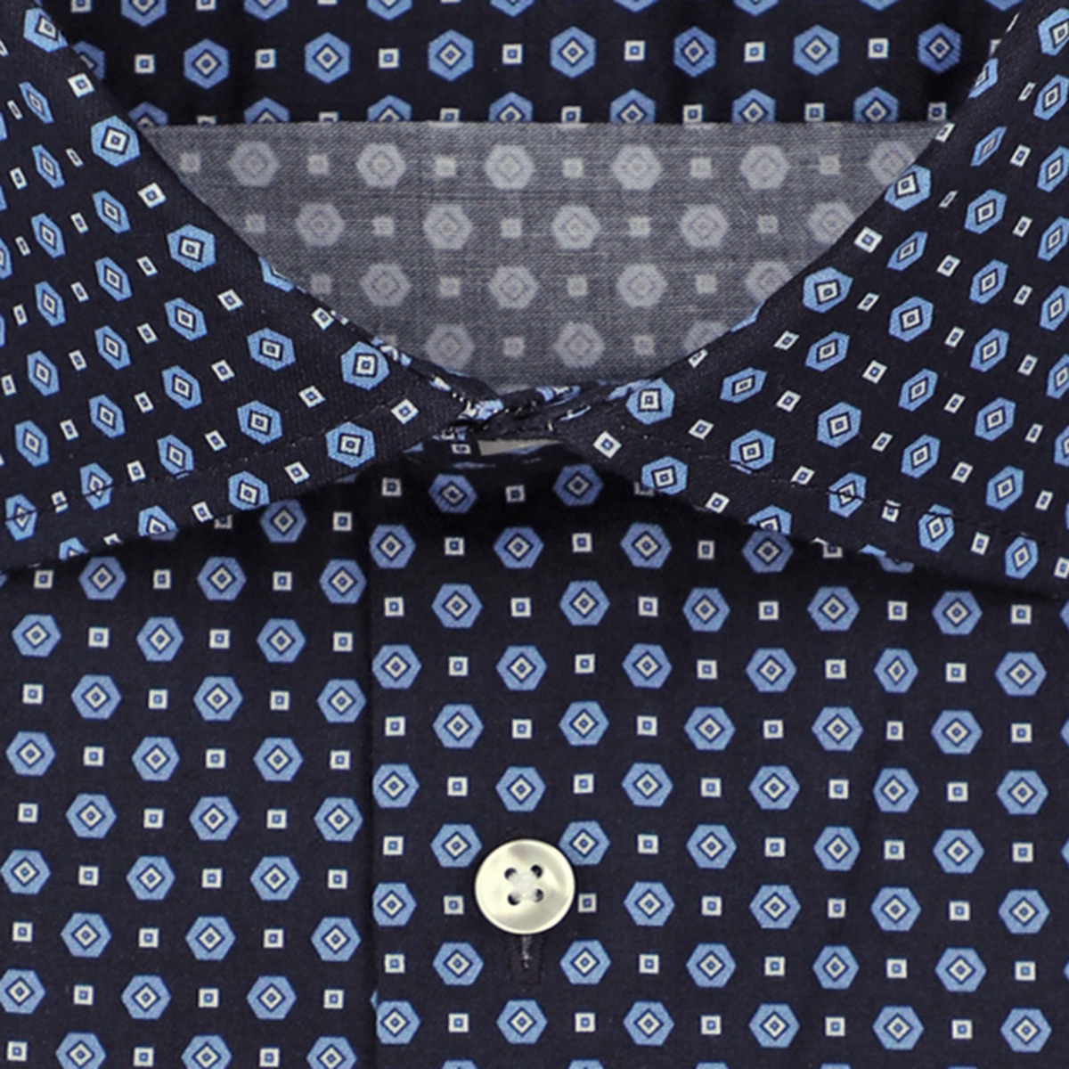 • Приталенный силуэт, Классический воротник, Классический (на пуговице), Принт, Синий