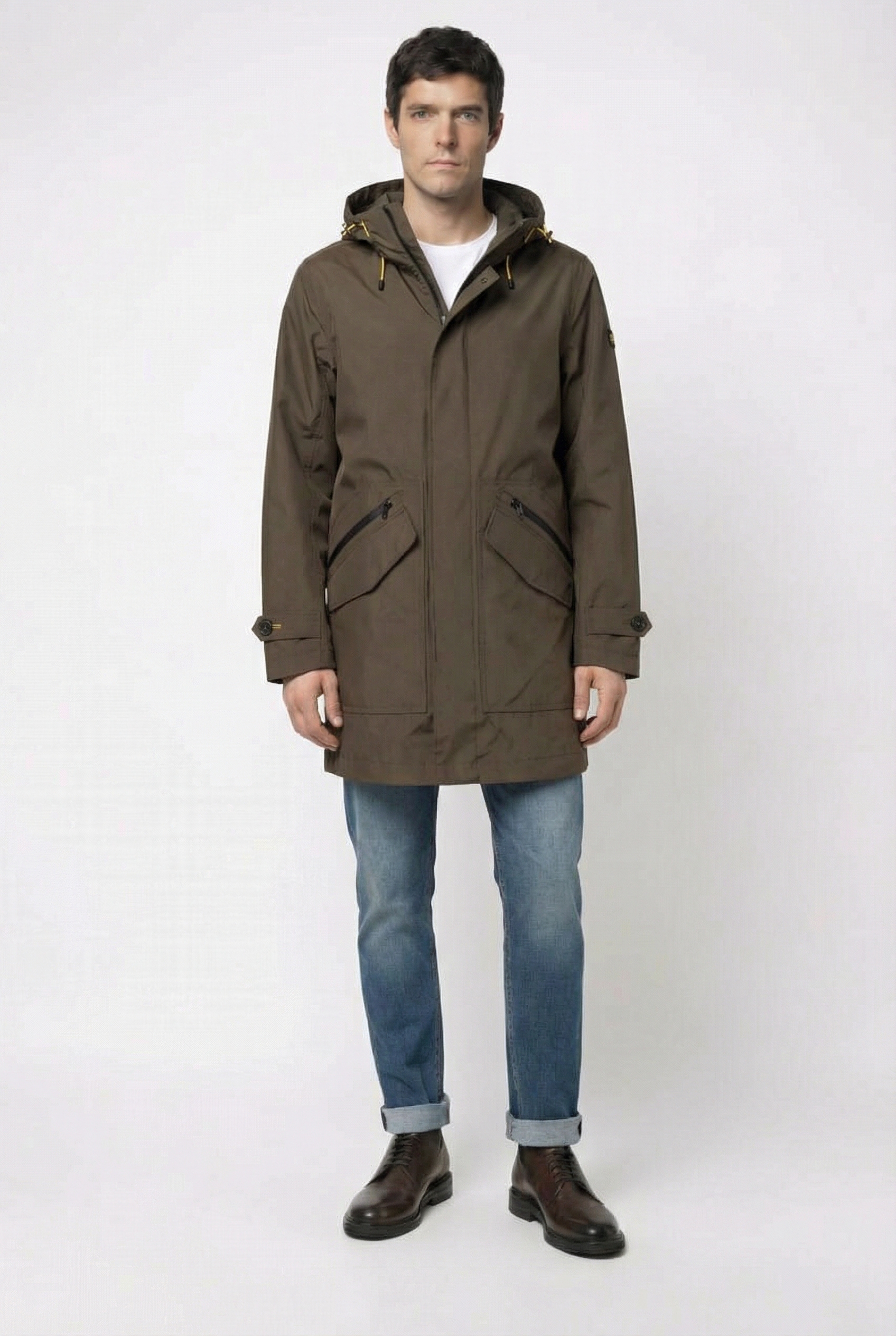 • Плащ с капюшоном прямого силуэта из ветрозащитного, водонепроницаемого материала с обработкой «Water-repellent». Капюшон с утягивающей кулисой. Застежка на молнию и ветрозащитный клапан на кнопках. Ширина рукава регулируется хлястиком с пуговицей. Регулируется по талии внутренней кулисой. Четыре боковых кармана ( два с застежкой на молнии и два с клапанами и застежкой на кнопки). Два внутренних кармана (один с застежкой на молнии). На левом рукаве фирменный логотип. Без подкладки. Отлично подходит для повседневной носки.